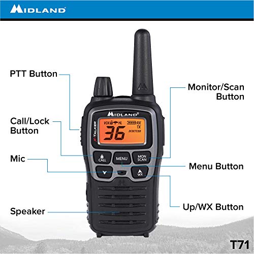 Specification: Midland T71VP3 36 Channel FRS Two-Way Radio – Up to 38 Mile Range Walkie Talkie – Black/Silver (Pack of 4), 6.2″ x 1.3″ x 2.3″, Model Number: T71X4VP3