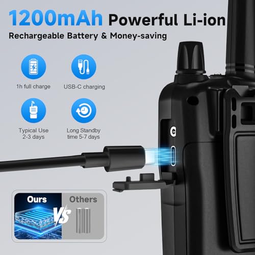 【MONEY-SAVING CHARGEABLE TYPE-C BATTERY】 Under normal circumstances,walkie talkie can be used for 72-96 hours with a full charge, and up to 8-12 hours with continuous use. The actual time depends on the frequency of use;1 hours to fully charge a battery from 0 capacity. Upgraded USB-C cable bonus,optimize mini USB interface makes sturdier. Economical and money-saving than battery models.
