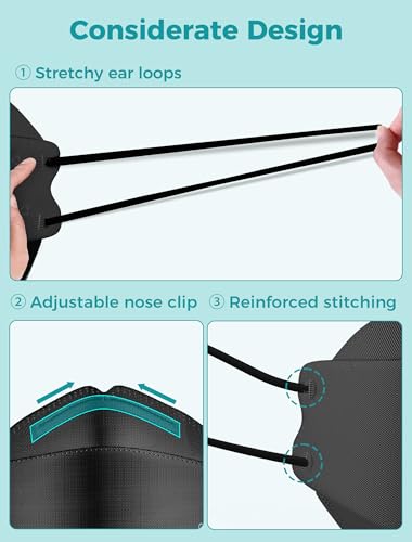 【Improved Fit】Designed with an ergonomic 3D shape, this mask offers ample breathing space and a secure fit. The adjustable nose clip enables a personalized fit, ensuring a tight seal to keep unfiltered air out.