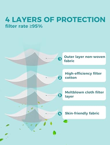 【Advanced Protection】The KN95 mask offers a 4-layer defense mechanism: an outer waterproof non-woven fabric that captures large particles, two melt-blown layers that filter more than 95% of fine particulates, and a soft hot air cotton layer that provides additional PM2.5 filtration.
