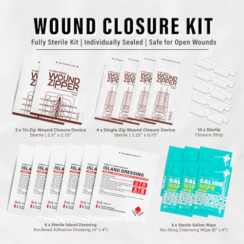 Wound Closure Kit | 28 Pcs All-in-One First Aid with Suture-Free, Stitchless Zip Devices, Butterfly Bandages, for up to 6″ Wounds | 100% Sterile Medical Supplies to Clean, Cover & Heal