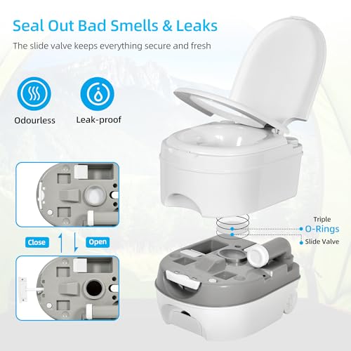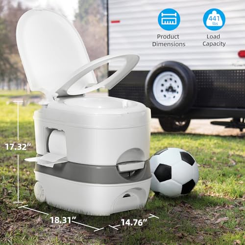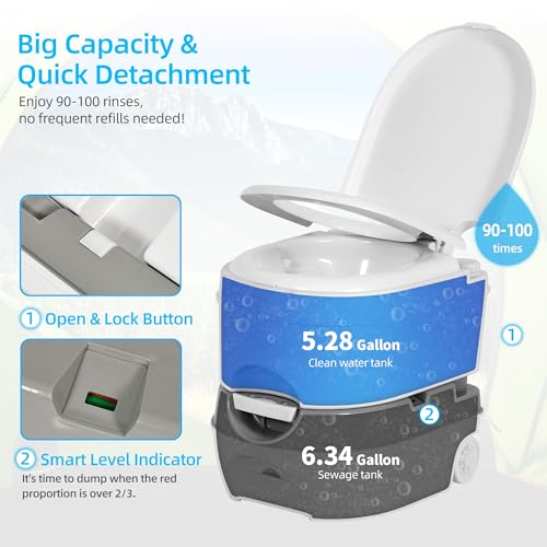 LARGE CAPACITY: The portable travel toilet has a 5.28 gallon (20L) freshwater holding tank and 6.34 gallon (24L) waste-water holding tank, which ensures the portable toilet for camping can be used for multiple times