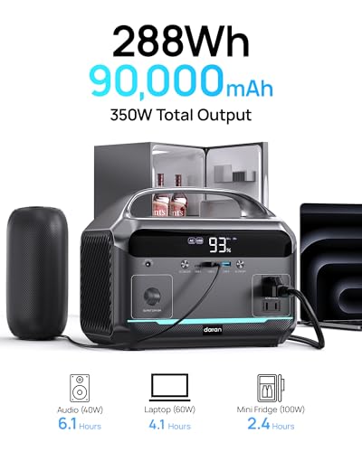 Dependable & Powerful: Our 2025-upgraded power bank offers 288Wh capacity to keep essentials running during outages, storms, or trips. For example, a30W CPAP can operate for about 8 hours (288Whx*0.85 conversionrate/30W=8.16 hours). Similarly, if your device is a 100W stew pot, then(288Whx0.85 conversion rate/100W=2.44 hours). The 350W powersupply does not support high-power products such as coffee machines.(Only suitable for powering devices within 350w).