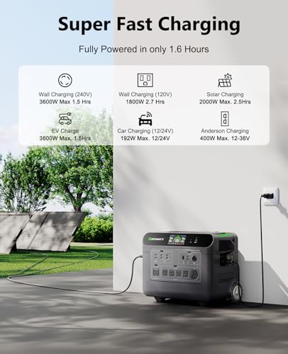 【6 Charging Methods】You have the flexibility to charge the battery with wall outlets (3hrs at 120V), solar panels (2.8hrs at 2000W), car outlets, vehicle alternators, EV chargers, other types of generators, or 20+ combo input methods to achieve ultra-fast 3600W charging in 1.5hrs. Quiet charge mode ensures silent operation for undisturbed work or rest.