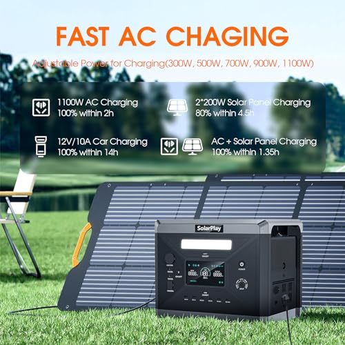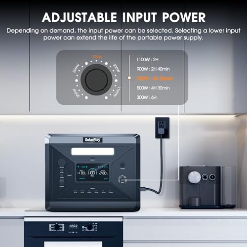 🌞[Adjustable input power and convenient to carry] Solarplay portable power station can adjust the input power in five levels: 300W, 500W, 700W, 900W, 1100W, and can be charged according to the usage environment and charging needs. You can use it more safely and also extend the service life of your portable power supply if you choose low input power.