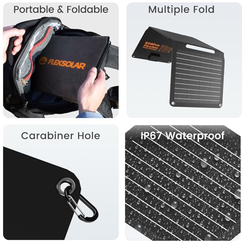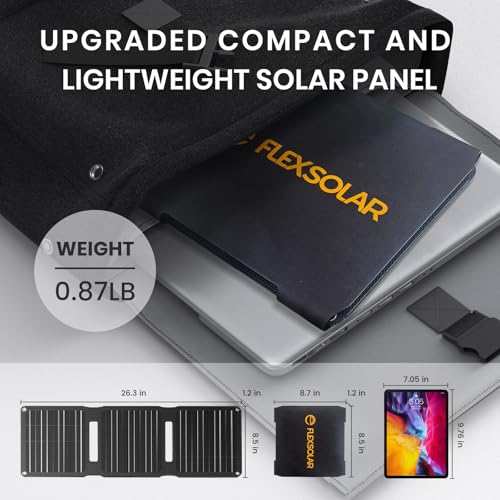 ✅ 【LIGHTWEIGHT & PORTABLE】The FlexSolar solar charger weight: 396g (0.86lbs), Folded Size :8.7×8.5×1.2in. Unfold Size: 26.3×8.5×0.1in. Compact size and lightweight make this portable solar panel easy to carry, and fits into any backpack for outdoor hiking, camping, climbing, RV trips, etc. And the solar panel comes with 2pcs carabiners, suitable for hanging on backpacks. It’s ideally suited for outdoor life and unexpected power outages.