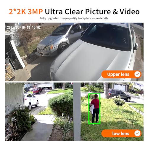 【1 Device = 2 Cameras,2K Ultra HD Resolution & Color Night Vision】Security Cameras Wireless Outdoor has two lens. 2 lens view cover 360°,Each lens is 3MP/2K with sharper colors and details, allowing you to see everything that is happening within your surveillance area. One camera but function as 2, double view coverage. The camera is built-in 8 leds, the light could be set to motion triggle on or always on at night or close,and when the lights are on at night, extraordinary color night vision adds a glow to every dark night.
