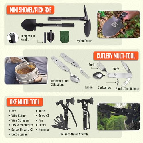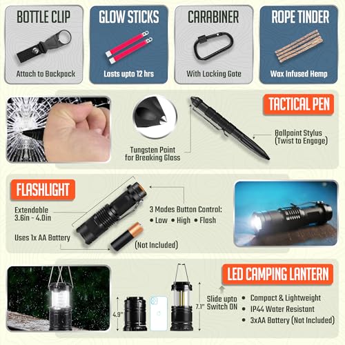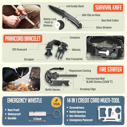 COMPREHENSIVE SURVIVAL KIT FOR ANY ADVENTURE: This kit equips you for camping, trekking, and more. It includes a 180-piece first aid kit and essential tools for fire-starting, warmth, navigation, fishing, signaling, and more.