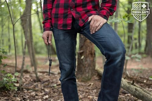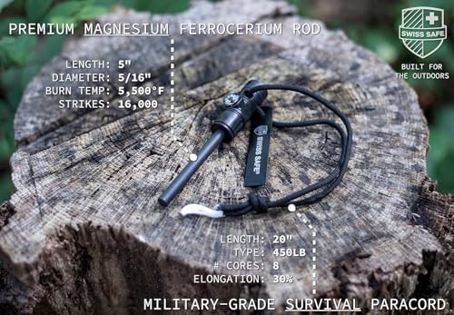 Swiss Safe 5-in-1 Magnesium Ferro Rod Fire Starter Survival Tool – Flint & Steel Striker, Compass, Paracord & Whistle – Emergency Kit for Backpacking, Camping, Hiking – All-Weather