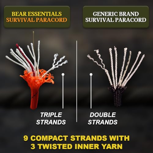 750LBS STRENGTH – THE ULTIMATE SURVIVAL CORD: This is not your average paracord. The Bear Essentials Survival Cord is designed for maximum utility and durability in survival, bushcraft, and emergency scenarios. With a breaking strength nearly 50% stronger than traditional Type III Mil Spec Paracord, ours is 750lbs with 11 strands and 2 specialized inner cores. This cord is perfect for demanding outdoor tasks. No Wire inside – which makes it heavier, difficult to cut and dulls your blade.
