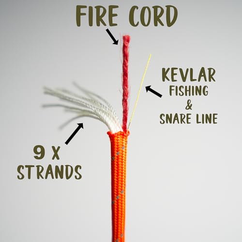 11 STRANDS FOR MAXIMUM VERSATILITY: The inner core contains 11 individual strands, including: 9x twisted nylon for bushcraft usage. Each strand has 3 straight yarns inside. 1x Waxed Firecord for fire starting 1x Kevlar Line for fishing, sewing, snaring and even friction sawing through wood!