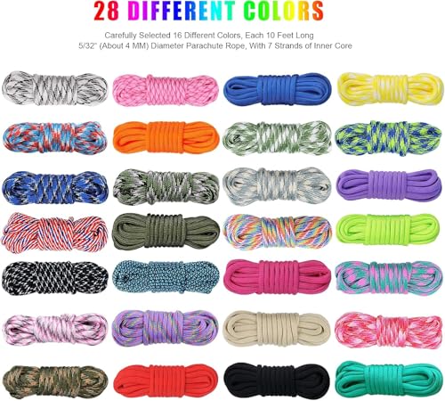 Our 550 paracord cord kit with 28 different colors, each 10 feet long. In order to help beginners get started quickly, we provide you with 3 kinds of starter paracord weaving instructions.