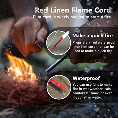 Revolutionary new fire paracord with survival cords: 1 PE braided fishing line(40lb), 1 red waterproof flax fire tinder and 1 cotton thread, measuring 5/32 inch in diameter. The Life-saving strands can catch fish or food, make instant fire, sew the clothes or wound, set traps and so on.