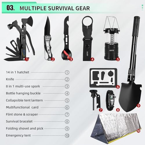 【Survival Gear and Supplies Kit】This survival kit includes a multifunctional axe with hammer and a detachable shovel with pick, both made of sturdy steel. Combined with wire saw, emergency tent and blanket, and parachute rope , you can quickly set up an emergency shelter to maintain your body temperature. Additionally, The emergency kit contains survival gears, like collapsible tent lantern, dual-tube whistle, and light stick, with these survival tools, you can signal for help in emergency.